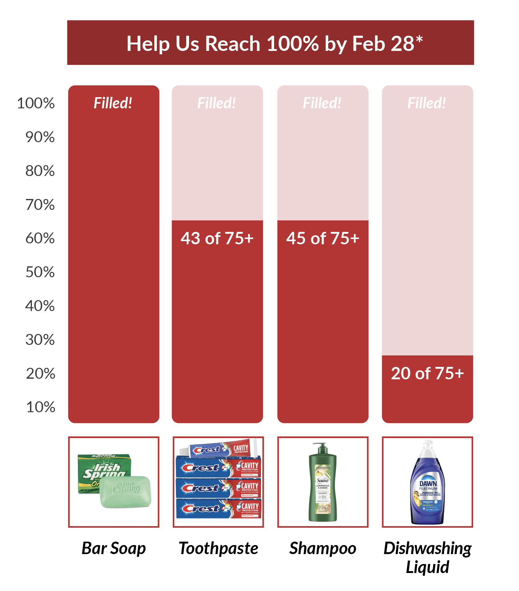 - Purchasing specific priority items listed to the below and dropping them off at the Parish Office. Note: CCC Priorities have changed to now include bar soap and shampoo. Our goal is 75+ for each item, each month.