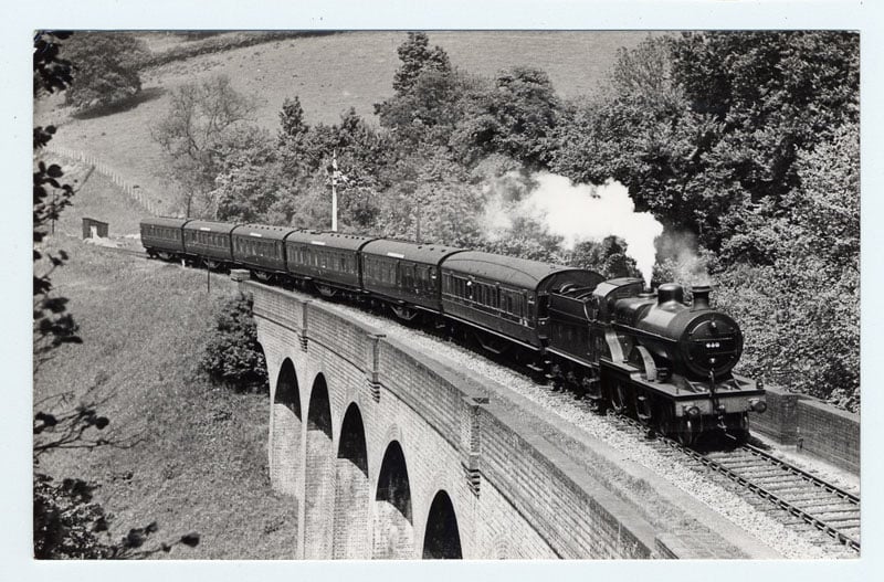 This photograph, taken in the 1930s, shows a Bournemouth express heading south over Tucking Mill Viaduct, a spot that will today be familiar to many as one of the most scenic stretches of the Two Tunnels Greenway.
