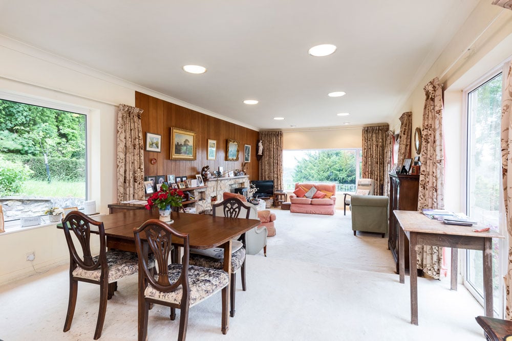 The accommodation, which is generally in need of some cosmetic updating throughout is entered into a large hallway with built in cloak cupboards and a desk area, doors lead to all rooms which include a guest cloak room and study. The impressive living accommodation comprises a large open plan, double aspect split level dining and sitting room which has a fabulous aspect over-looking the gardens and enjoying the views; it also conveniently leads onto the sun terraces which wrap around the property. The kitchen and utility room lead from the dining area and are both spacious, well equipped and have access to the gardens.