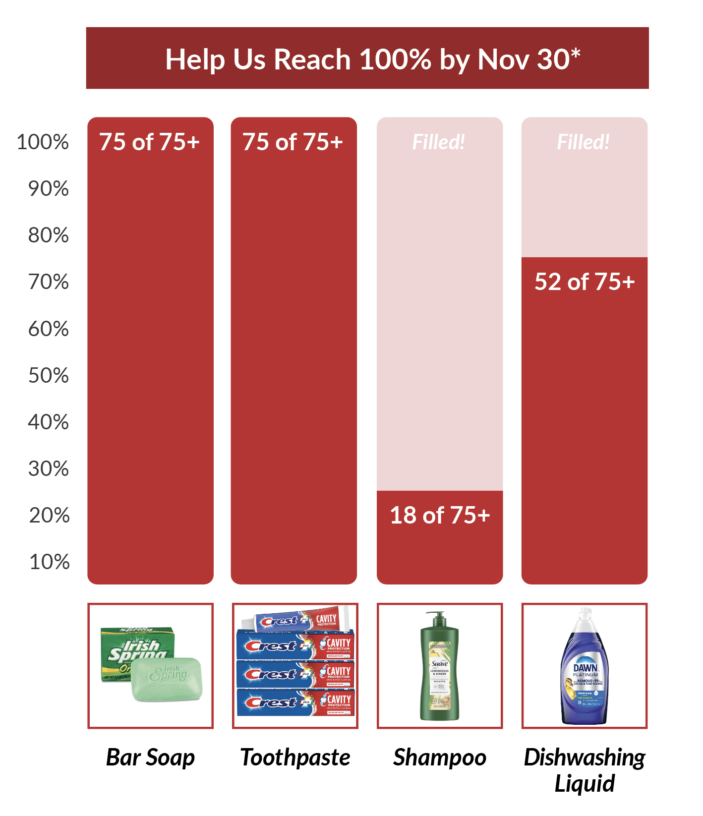 - Purchasing specific priority items listed to the below and dropping them off at the Parish Office. Note: CCC Priorities have changed to now include bar soap and shampoo. Our goal is 75+ for each item, each month.